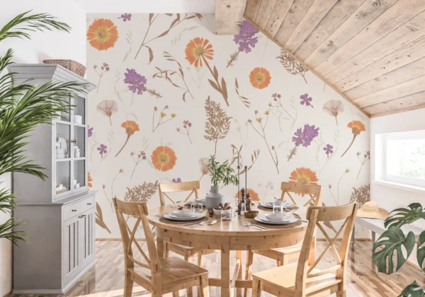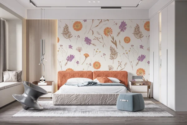 Ce papier peint floral délicat révèle une composition botanique d’une rare finesse, où gerberas orangés aux pétales lumineux côtoient de gracieuses fleurs violettes aux nuances lavande. Les motifs botaniques pressés évoquent l’art ancestral de l’herbier, sublimé par une technique de reproduction fidèle qui capture chaque détail : nervures des feuilles séchées, texture satinée des pétales, ramifications délicates des graminées sauvages. Sur un fond crème nacré, cette symphonie végétale déploie ses tons pastel naturels – orange corail, mauve tendre, beige doré – dans une harmonie chromatique apaisante qui évoque les derniers feux de l’automne.